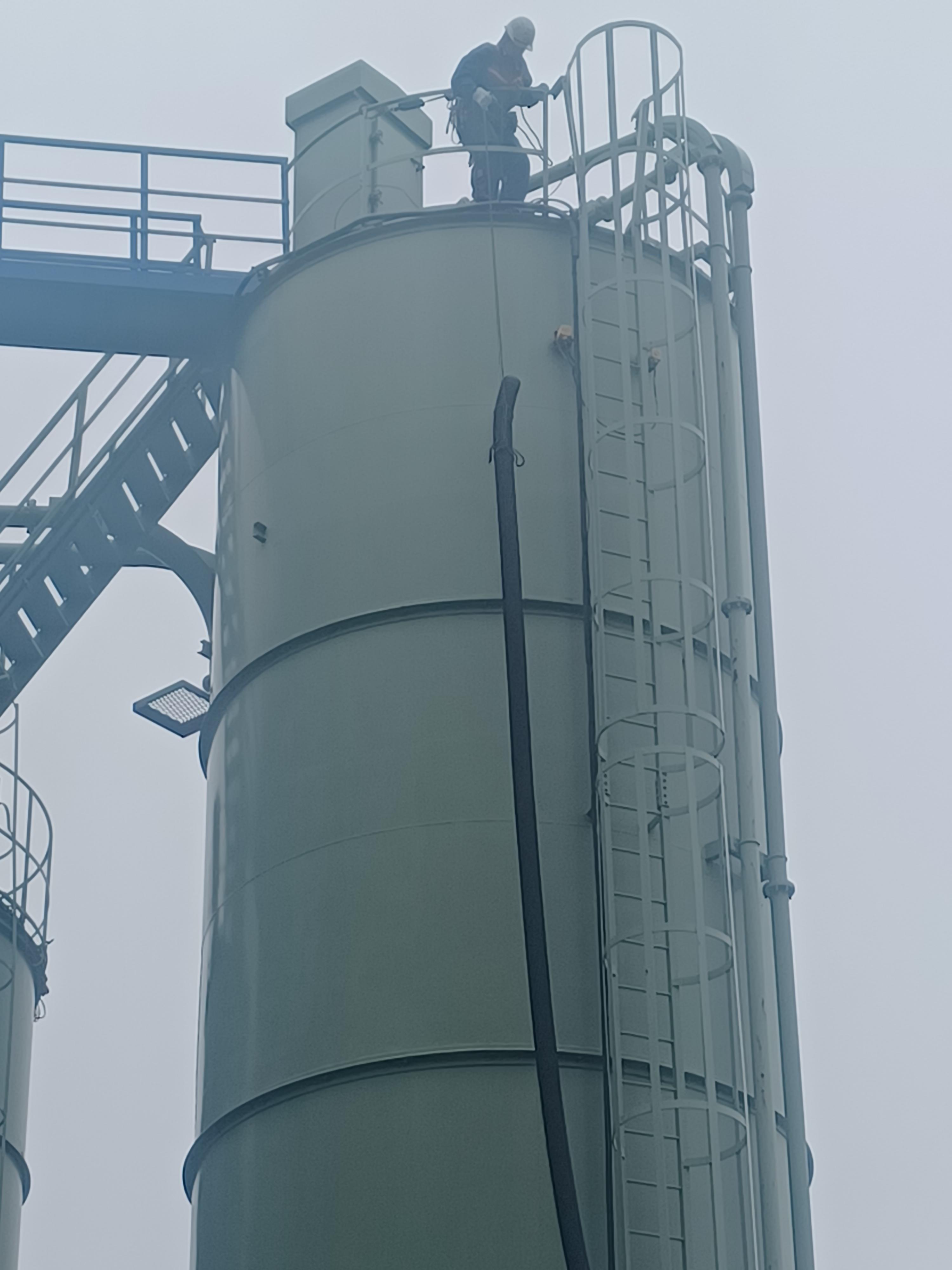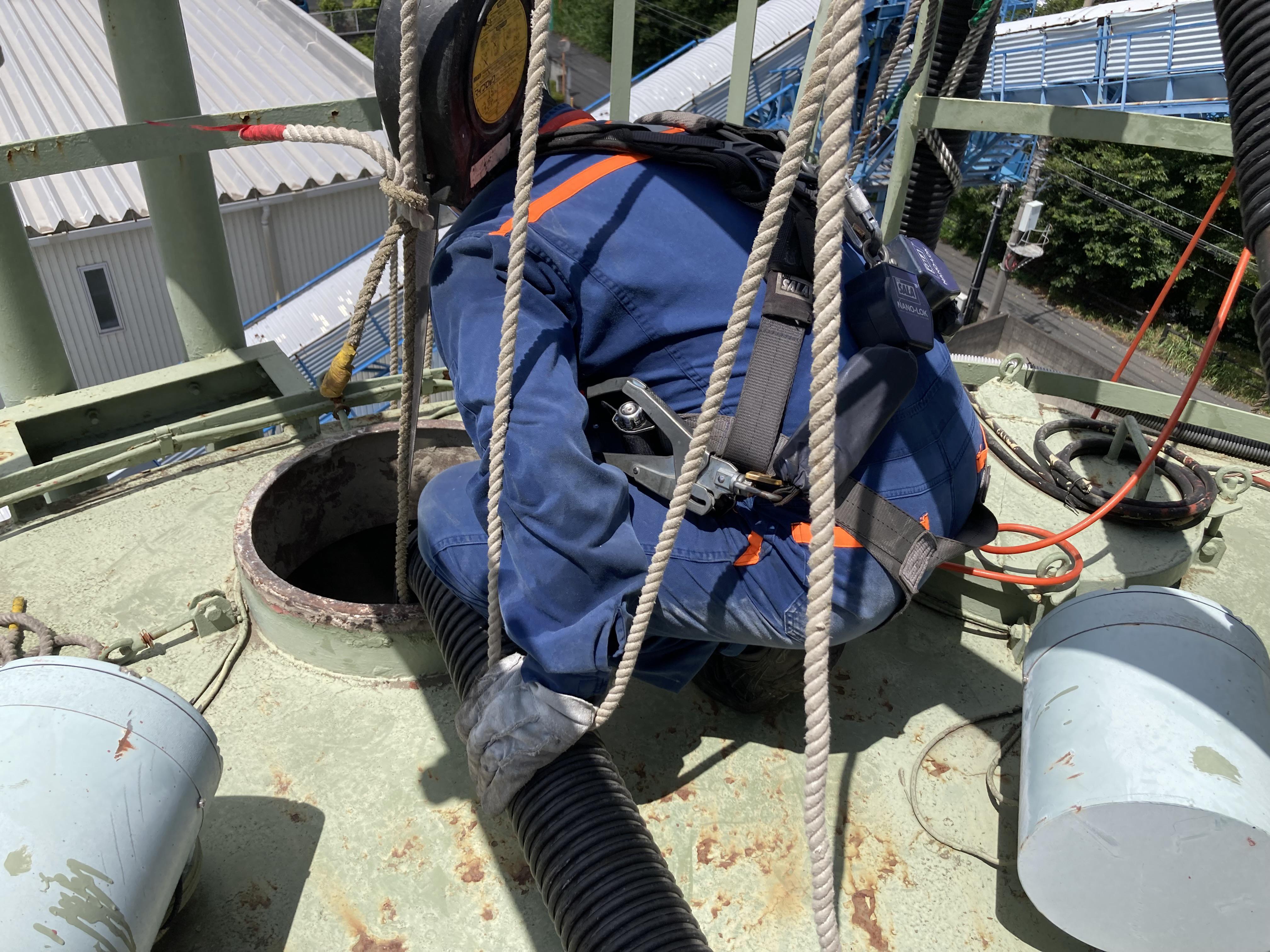 今回は15mほどの高さのセメントサイロからコンクリート原料を取り出す作業を行いました。