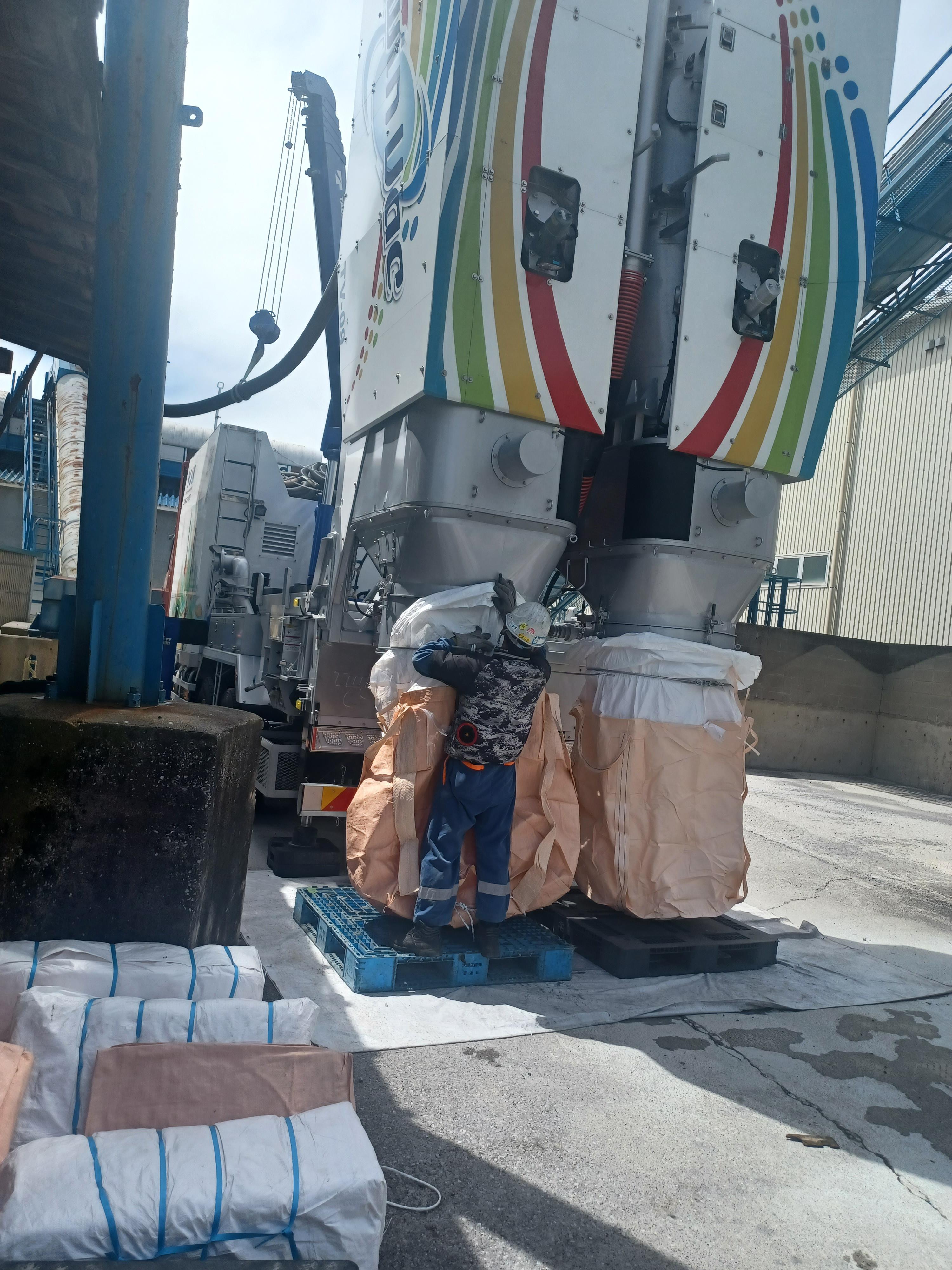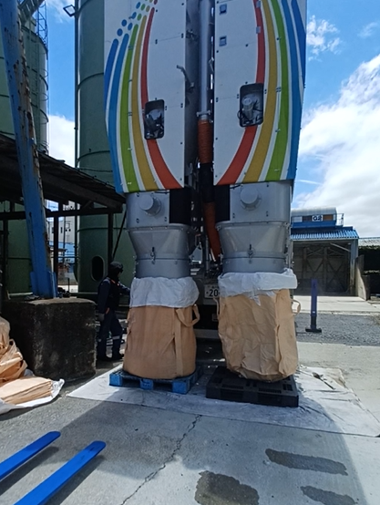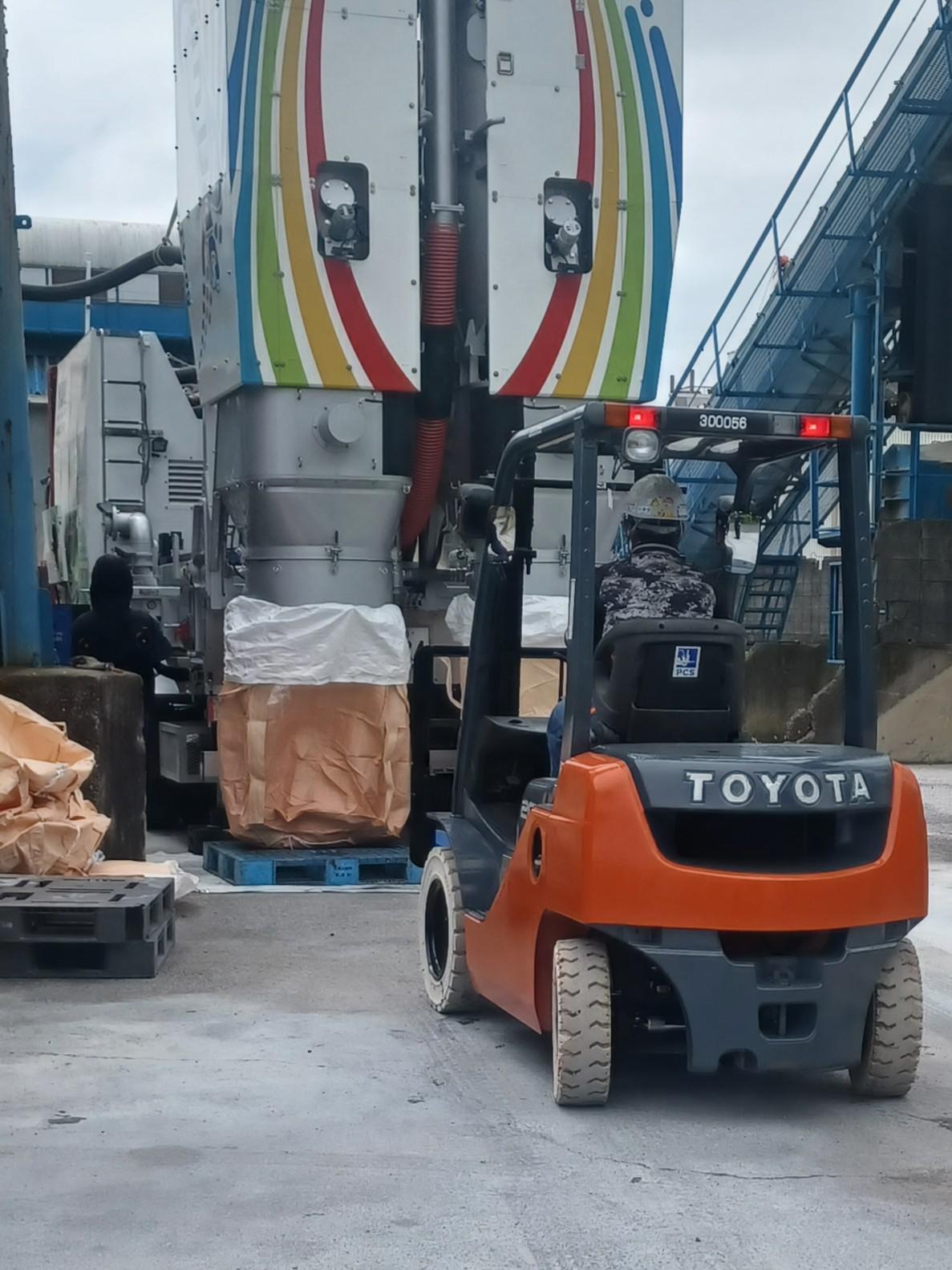 粉体が入ったフレコンは取り外して、口を縛り、フォークリフトで運びます。