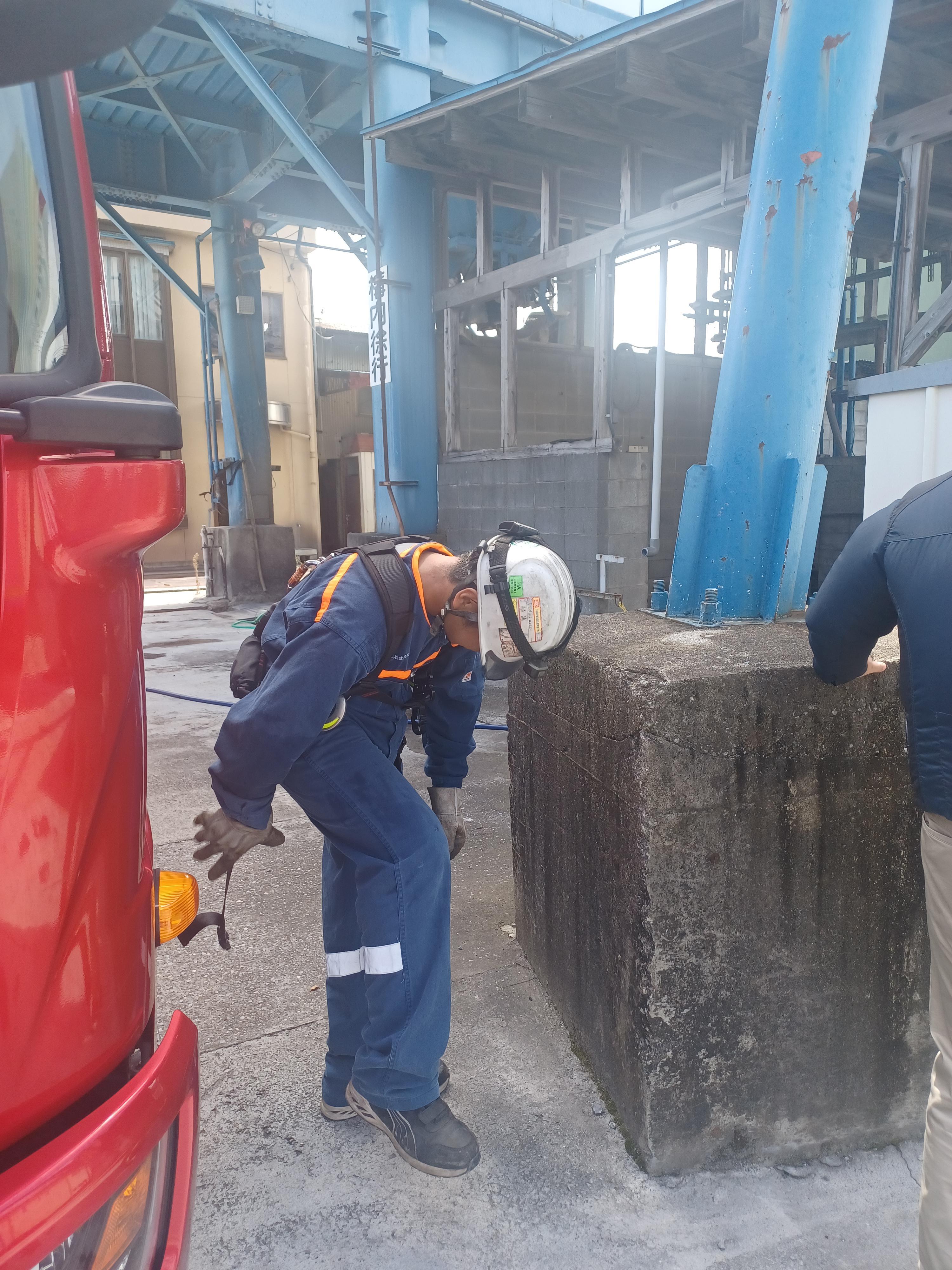 また、セメントサイロの中に入り作業を行うためガス検知器、酸素濃度の計測はもちろんのこと、無線機を携帯して作業を行います。