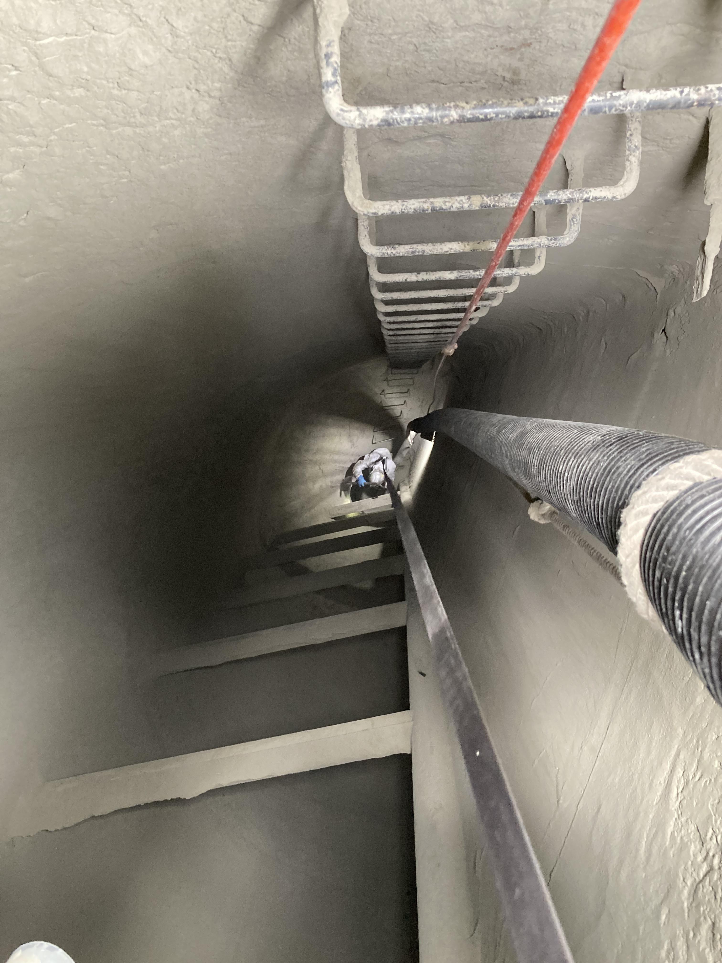 セメントサイロの中では以下の写真のように、セメントサイロの中をハシゴで降りて人の手でかき集めながらホースで吸引しています。