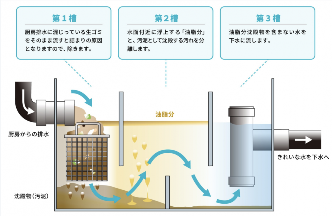 油や食品残渣が下水に直接流れ込むのを防ぎ、法律によって設置が義務付けられています。