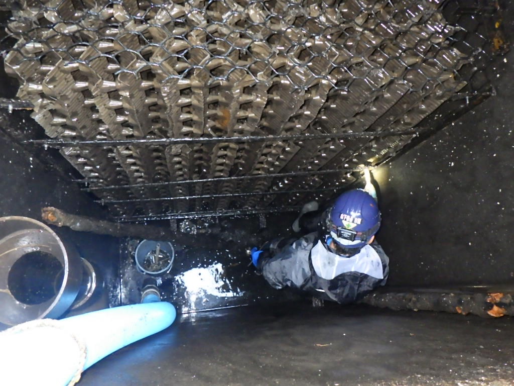 接触酸化槽は微生物が担体(接触剤)に付着して安定した処理を行う仕組みですが、長期運転すると担体や槽内にスカムや汚れが蓄積します。これを放置していると目詰まりやバイオフィルムの不均一化が起こり、処理能力の低下や悪臭発生、放流水基準未達のリスクが高まります。